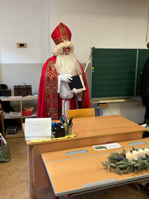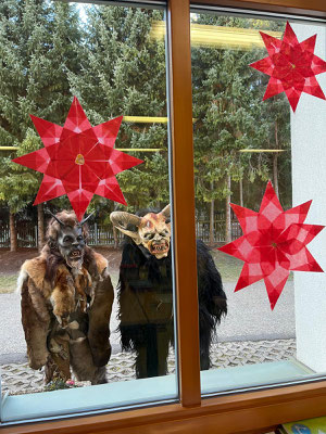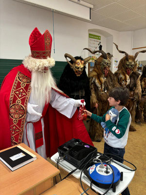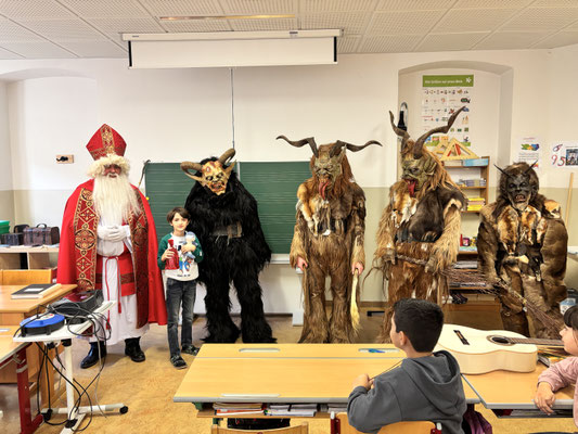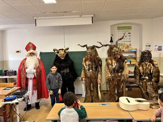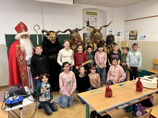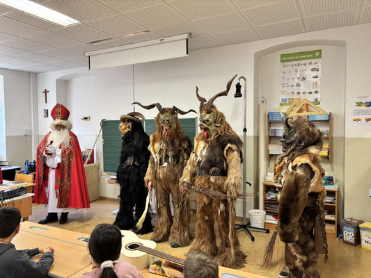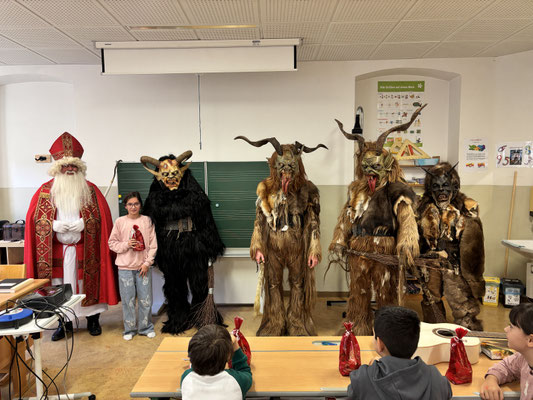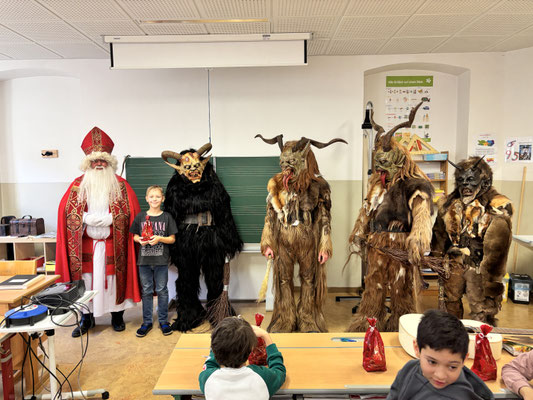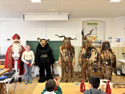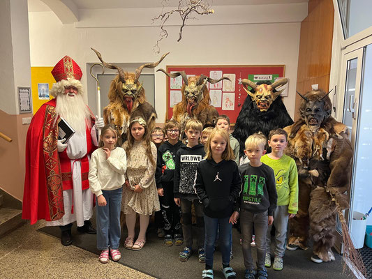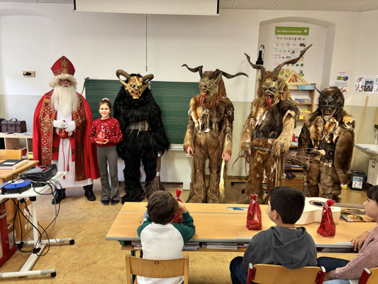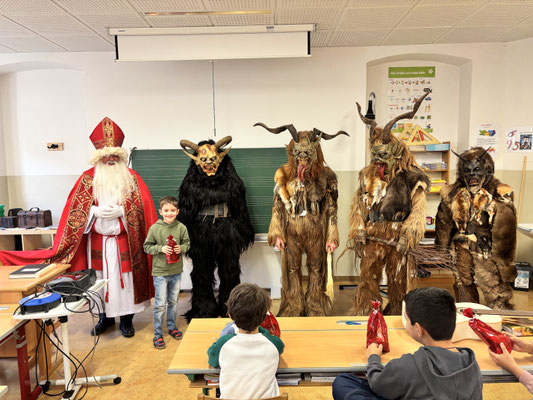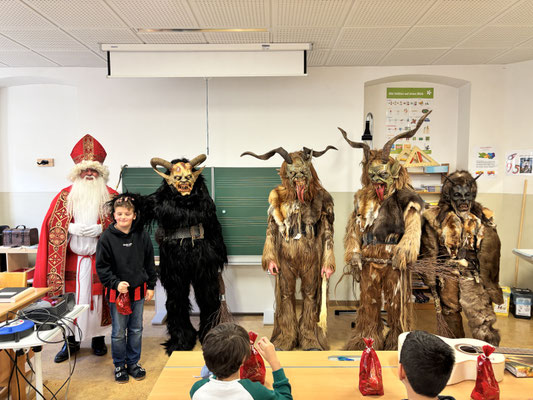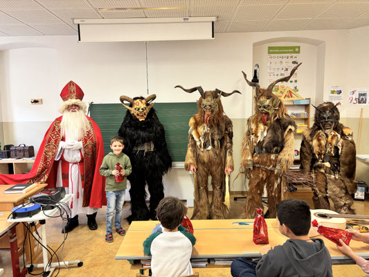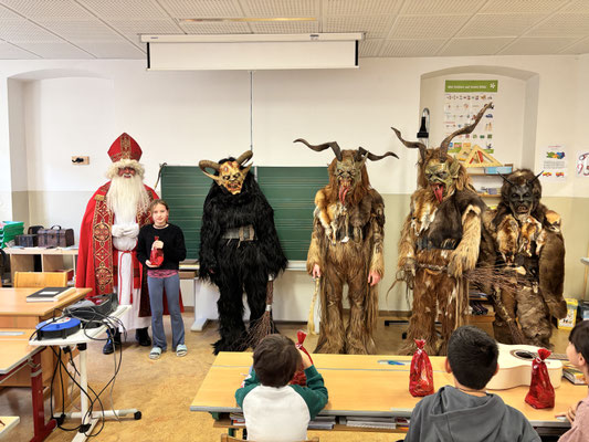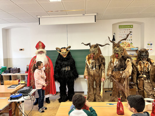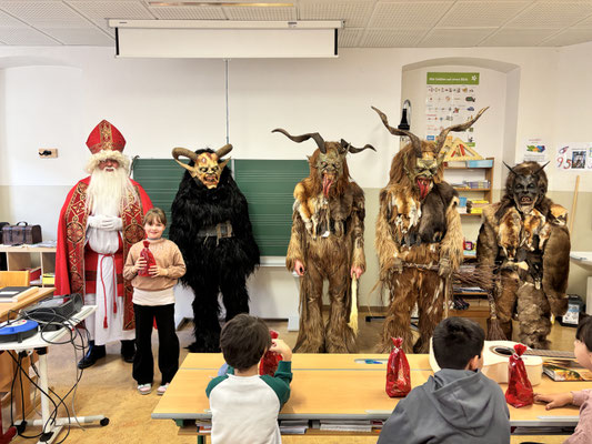 Am 6. Dezember war die Freude an unserer Schule groß: Der Nikolaus besuchte uns gemeinsam mit vier beeindruckenden Krampussen der Zechgemeinschaft Töplitsch. Jedes Kind erhielt ein prall gefülltes Säckchen, das der Nikolaus höchstpersönlich inmitten seiner Begleiter überreichte.